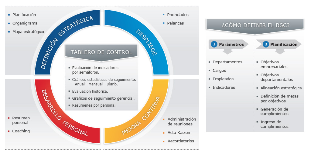El sistema proporciona un conjunto completo de herramientas e indicadores de gestión y rendimiento, cuyo objetivo principal es alinear los recursos de la empresa con la estrategia, supervisar su aplicación, comunicación y dar el seguimiento adecuado para optimizar los resultados y maximizar las fortalezas de la compañía.
