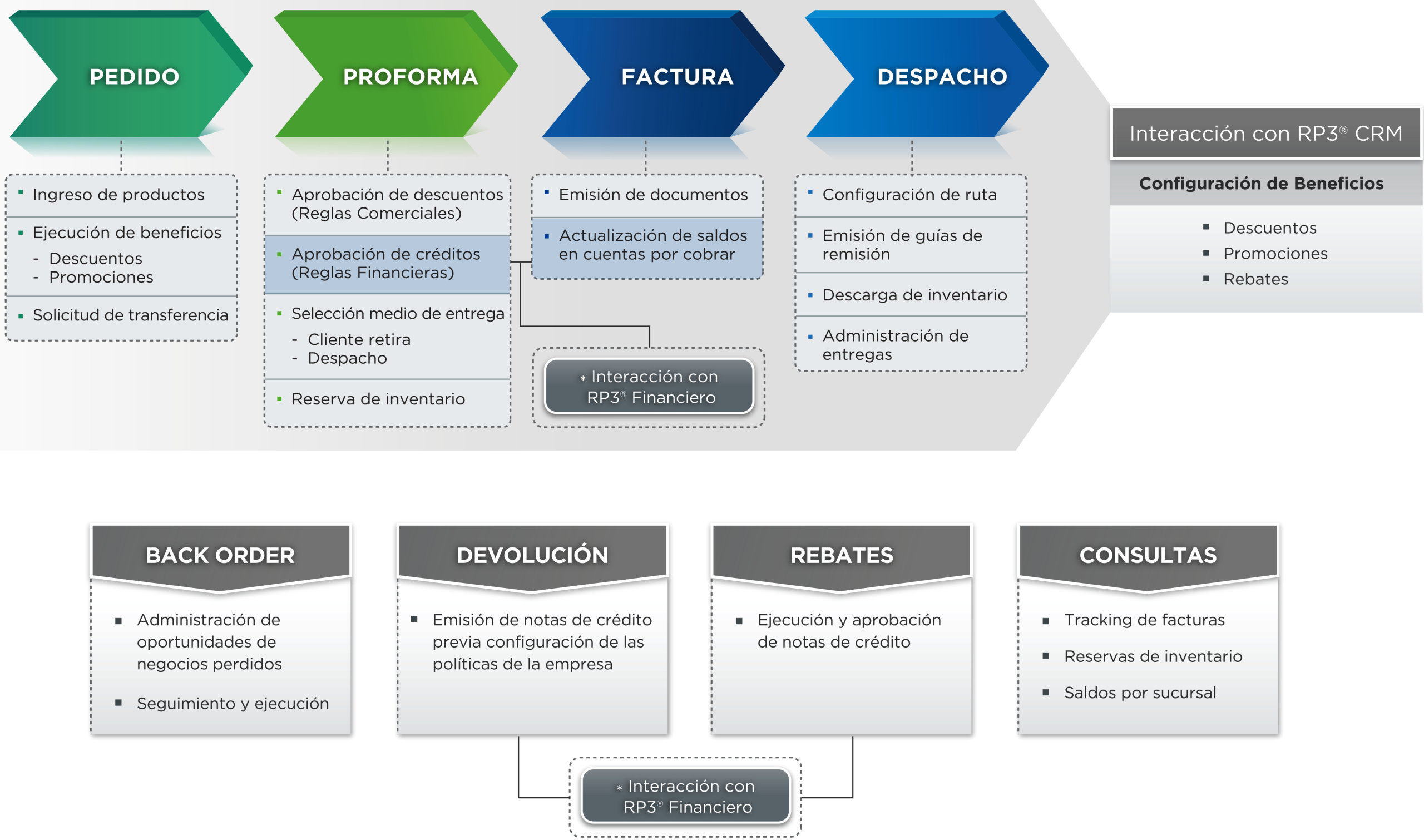 A su vez cuenta con el motor de beneficios de RP3® CRM permitiéndole configurar descuentos, promociones y rebates rápidamente. Además se integra fácilmente con el sistema financiero de la empresa para gestionar la aprobación de créditos y creación de los registros contables de cuentas por cobrar.